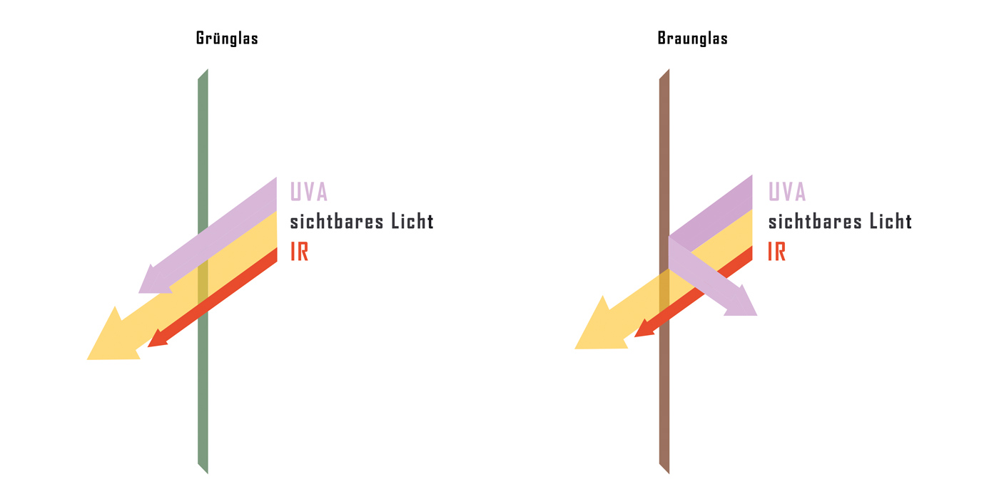 Glas steht uns heute in unzähligen Formen und Farben als Verpackungsmaterial zur Verfügung. Dabei ist Mehrzahl der Glasverpackungen unabhängig von der Farbe komplett lichtdurchlässig. Das durchdringende Licht in normalem Glas führt zu molekularen Abbauprozessen des Inhaltes, was zu einer begrenzten Haltbarkeit führt.