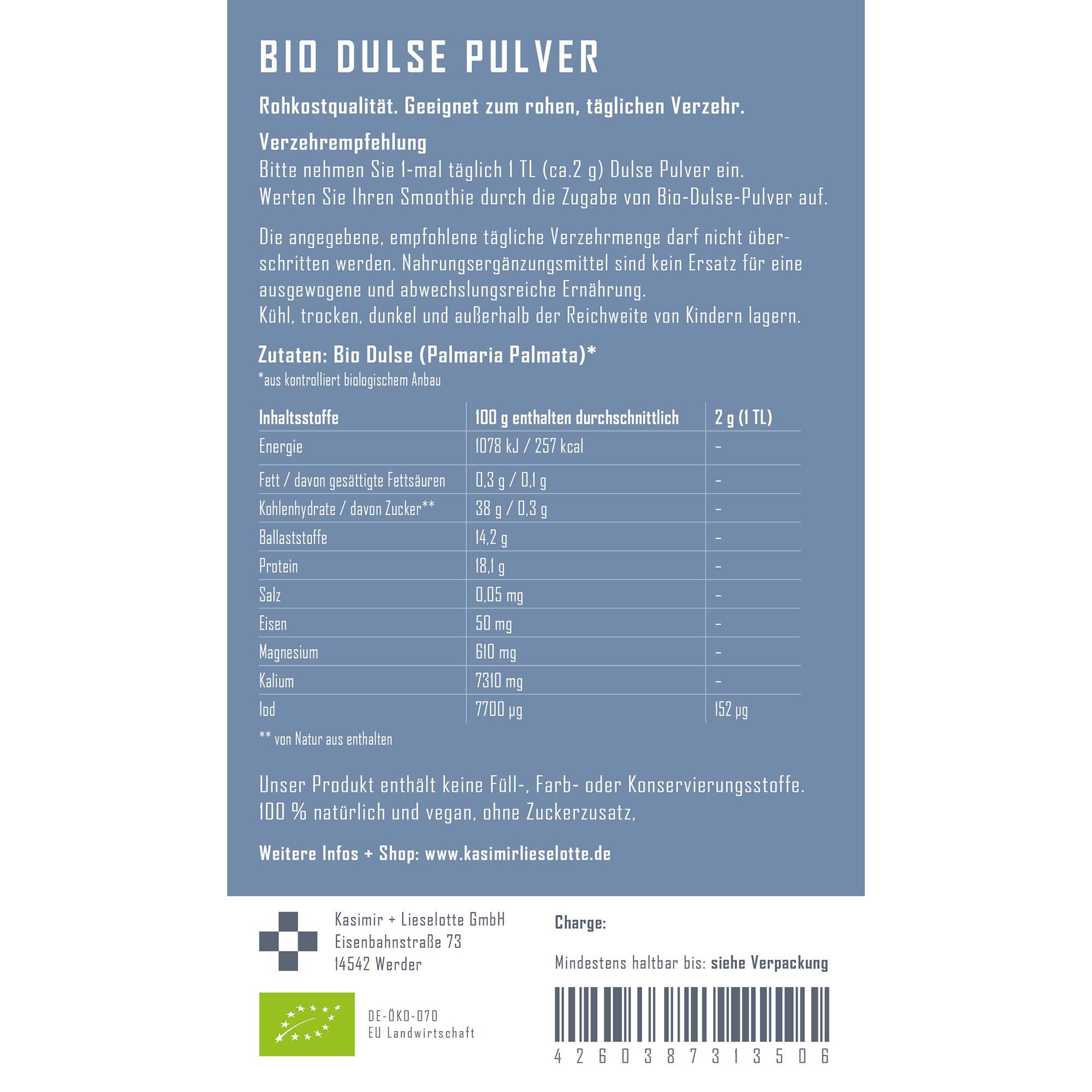 Die Dulse-Alge (Plamaria palmata) ist eine ideale Ergänzung für eine ausgewogene und gesunde Ernährung. Nachdem die Algen in den klaren, kalten Wassern der Bretagne herangewachsen sind, werden sie bei niedrigen Temperaturen schonend getrocknet und zu Bio-Dulse-Pulver gemahlen. Dulse ist auch als Lappentang bekannt und kommt in den Küstengewässern des Pazifiks und des Atlantiks vor. Die gemahlenen Algen stammen aus kontrolliert-biologischem Anbau. 100 % natürlich, ohne Chemikalien und Zusatzstoffe