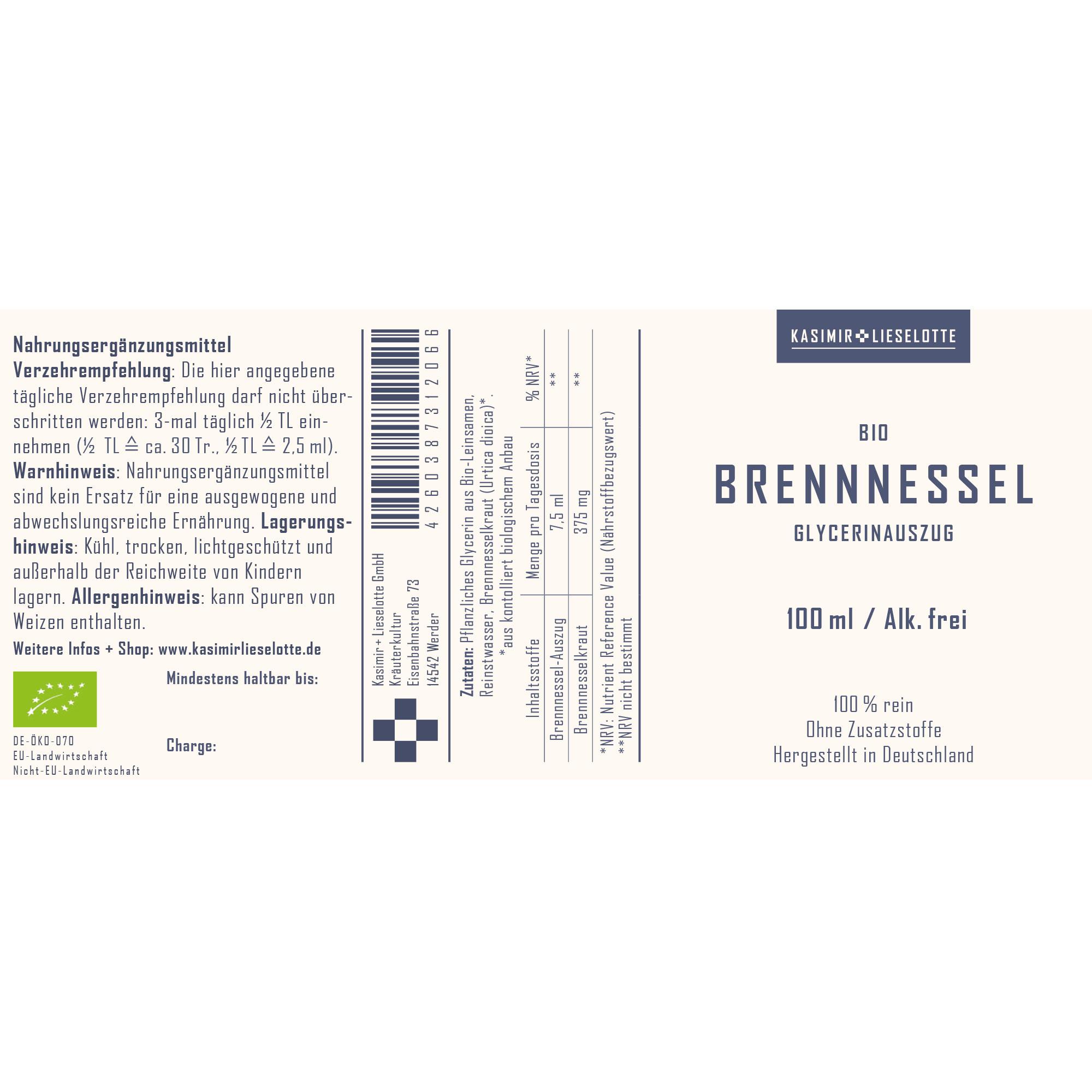 Unsere alkoholfreie Brennnessel-Tinktur wird aus Brennnesselkraut aus kontrolliert biologischem Anbau hergestellt und zu einem kräftigen Auszug angesetzt (Ansatz 1:3). Bis zum Abfüllen wird die alkoholfreie Brennnessel-Tinktur regelmäßig aufgeschüttelt und reift für mindestens drei Monate.