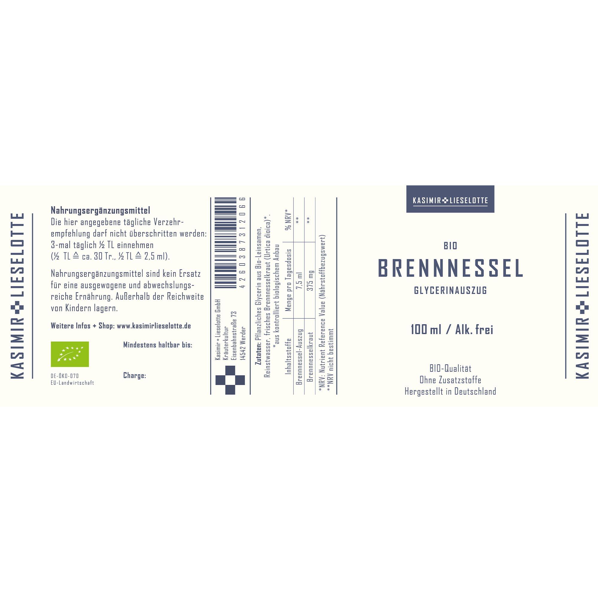 Unsere Brennnessel-Tinktur wird aus frischen Brennnesselblättern hergestellt und direkt nach der Ernte zu einer feinen Tinktur angesetzt (Ansatz 1:3). Durch den alkoholischen Auszug werden wasser- und fettlösliche Inhaltsstoffe gleichermaßen extrahiert, so dass alle wirksamen Inhaltsstoffe der Brennnessel in der Tinktur verfügbar sind. Bis zum Abfüllen wird die Brennnessel-Tinktur regelmäßig aufgeschüttelt und reift für mindestens drei Monate. Die Brennnesseln für unsere Tinkturen sammeln wir ausschließlich im Freien. Sie werden von uns in sorgfältiger Handarbeit gepflückt und stammen aus deutscher Wildsammlung. Zur Gewährleistung bester Qualität verzichten wir bei der Herstellung unserer Brennnessel-Produkte auf die Verwendung von Chemikalien und Zusatzstoffen. Produktinformationen Unser Produkt enthält keine Füll-, Farb- oder Konservierungsstoffe. 100 % natürlich und vegan, ohne Zuckerzusatz. Bio Zertifizierung Unser Produkt ist nach Ökokontrollstelle DE-ÖKO-070 EU Landwirtschaft biozertifiziert. Verzehrempfehlung Soweit nicht anders verordnet, 3-mal täglich 40 Tropfen einnehmen. Bei Bedarf kann die Tinktur in Wasser verdünnt eingenommen werden. Vor dem Herunterschlucken kurz im Mundraum wirken lassen. Es bietet sich an, die Tinktur vor der Mahlzeit zu sich zu nehmen. Mengenverhältnisse: 1/2 TL ≙ ca. 50 Tropfen, 40 Tropfen ≙ 2 ml Für alle Naturprodukte empfiehlt sich, spätestens alle 6 Wochen ein Einnahmepause von 14 Tagen einzulegen. Zutaten Reinstwasser, Bio-Alkohol (Alk. 96% vol), Brennnesselkraut*.*aus Wildsammlung. Nährwertdeklaration Energie pro 100 ml: 942 kJ / 225 kcal Energie pro Portion (1 TL ≙ 5 ml): 47,1 kJ / 11,25 kcal Enthält geringfügige Mengen Fett, gesättigte Fettsäuren, Kohlenhydrate, Eiweiß und Salz. Wichtige Hinweise Die angegebene, empfohlene tägliche Verzehrmenge darf nicht überschritten werden. Nahrungsergänzungsmittel sind kein Ersatz für eine ausgewogene und abwechslungsreiche Ernährung. Bei Krankheiten, der Einnahme von Medikamenten, bei Schwangerschaft und in der Stillzeit sollte vor Einnahme von Nahrungsergänzungsmitteln der Arzt oder Heilpraktiker des Vertrauens konsultiert werden. Ob und welche Nahrungsergänzungsmittel bei Kindern und Jugendlichen sinnvoll sind, gehört ebenfalls in die professionellen Hände eines Kinderarztes oder Therapeuten. Lagerung Gut verschlossen, kühl, trocken und dunkel lagern. Außerhalb der Reichweite von Kindern aufbewahren. Herkunft Hergestellt in Deutschland. Inhalt 100 ml ℮