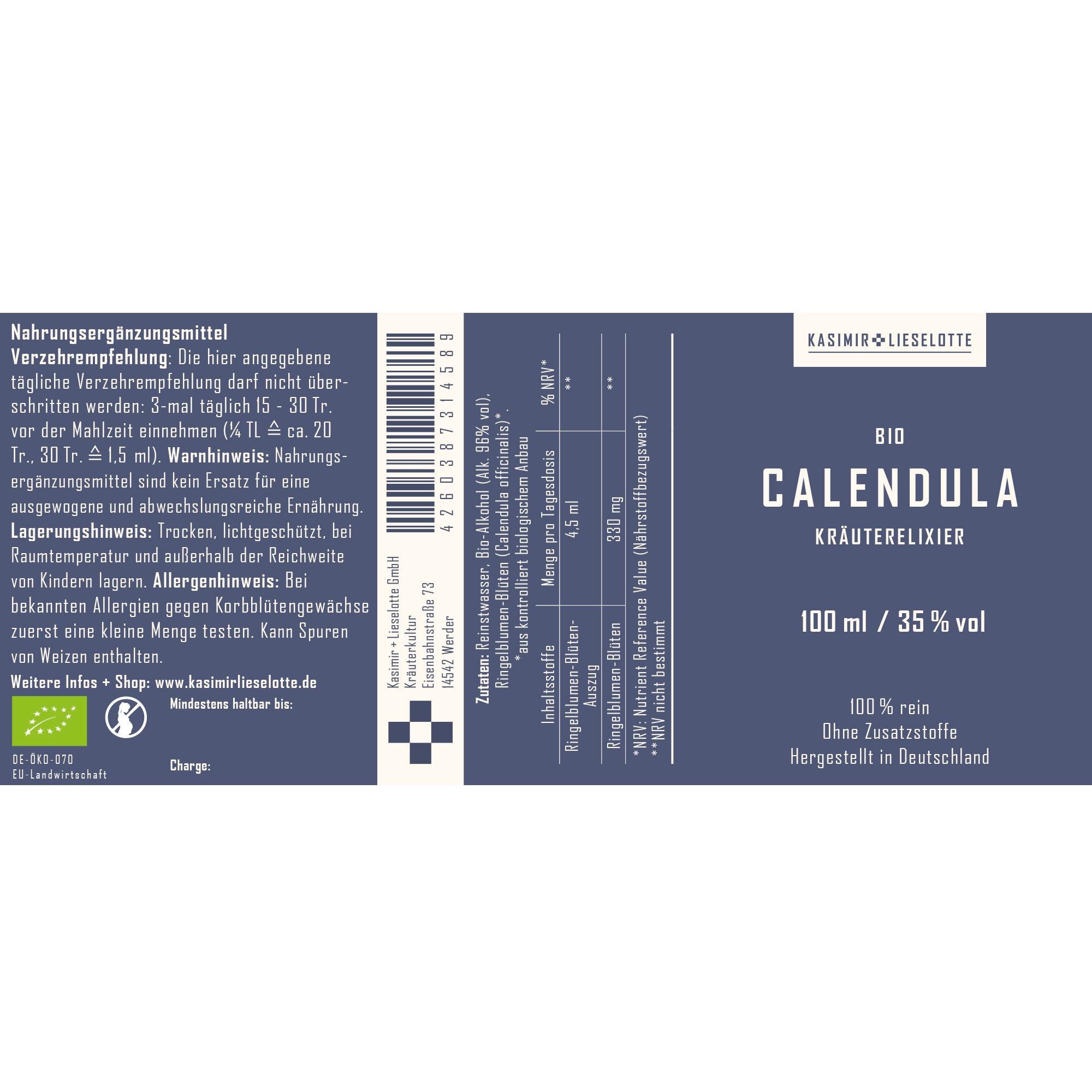Reinstwasser, Bio-Alkohol (Alk. 96% vol), Ringelblumen-Blüten (Calendula officinalis) *. *aus kontrolliert biologischem Anbau.