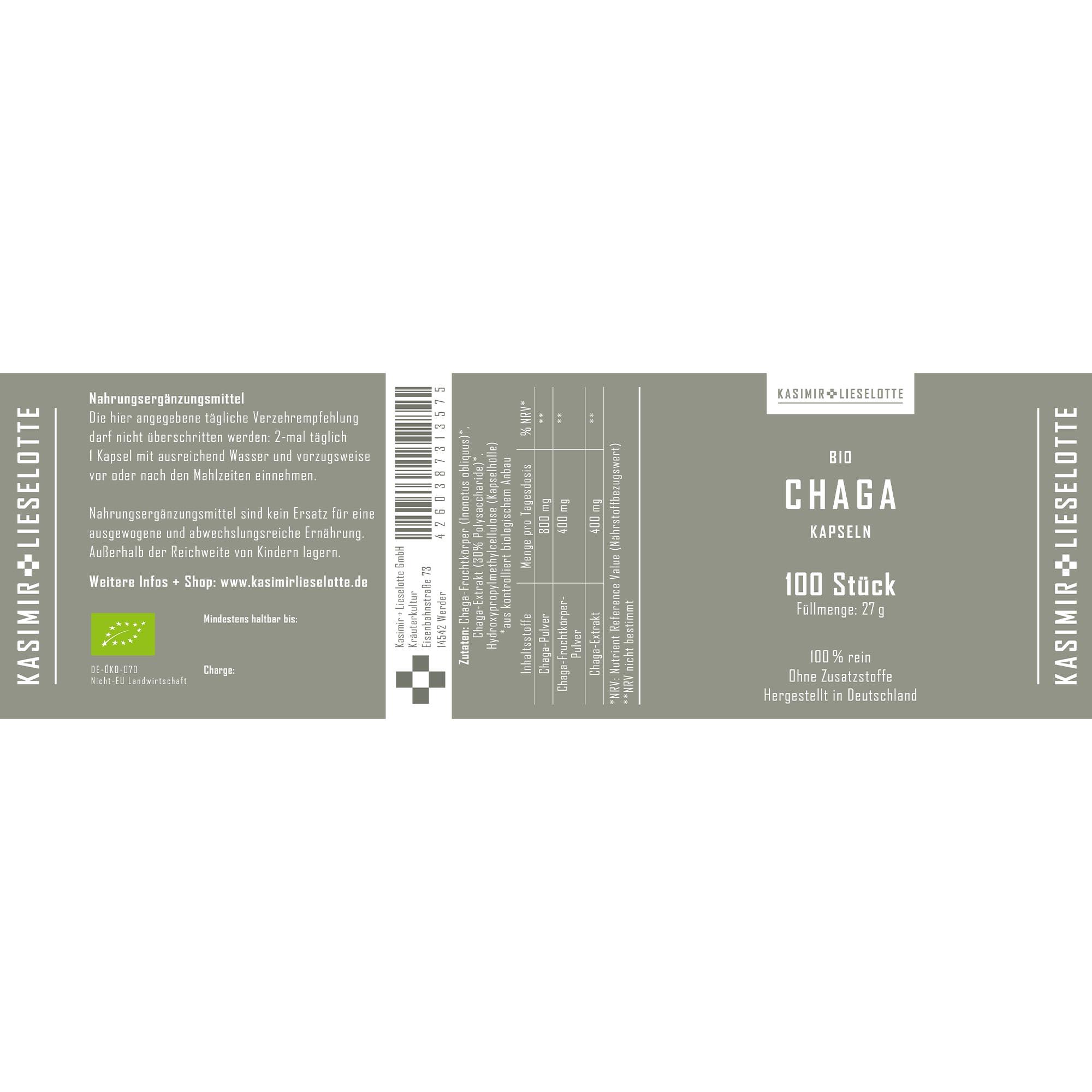 Chaga-Pulver (Fruchtkörper)*, Chaga-Extrakt (30% Polysacharide)*, Hydroxypropylmethylcellulose (Kapselhülle).