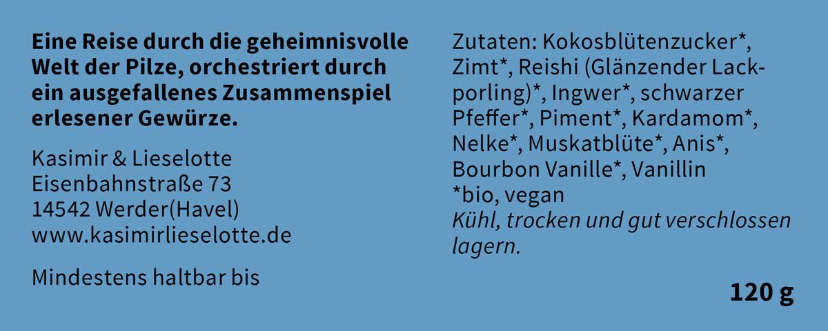 Kokosblütenzucker, Zimt, Reishi (Glänzender Lackporling), Ingwer, Schwarzer Pfeffer, Piment, Kardamom, Nelke, Muskatblüte, Anis, Vanillin.