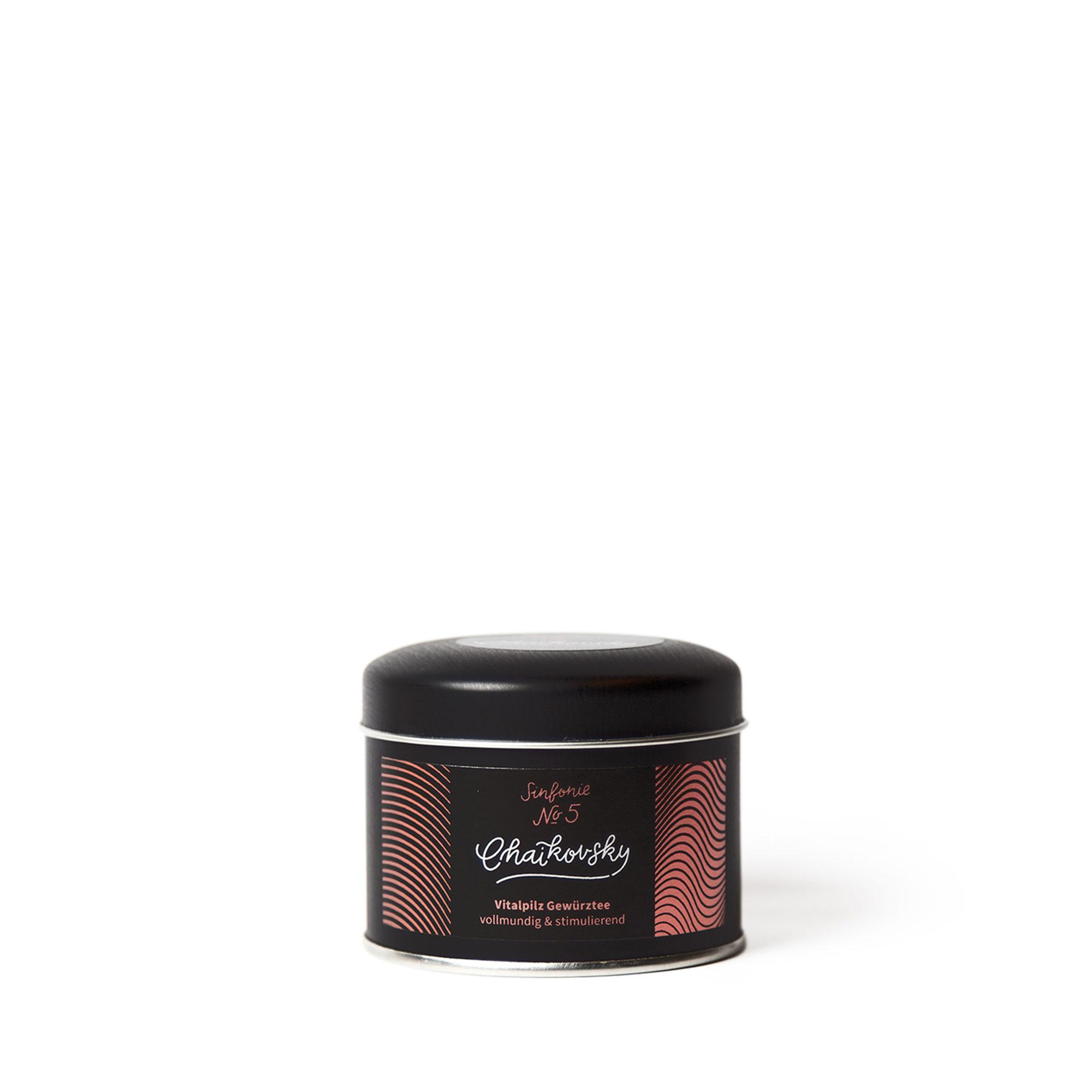 Unsere Chaikovsky Sinfonie № 5 in der handlichen 120 g Dose. Sinfonie № 5 trägt eine klassische Chai-Note und ist eine natürlich belebende Vitalpilz Gewürzteemischung für einen energiereichen Start in den Tag.