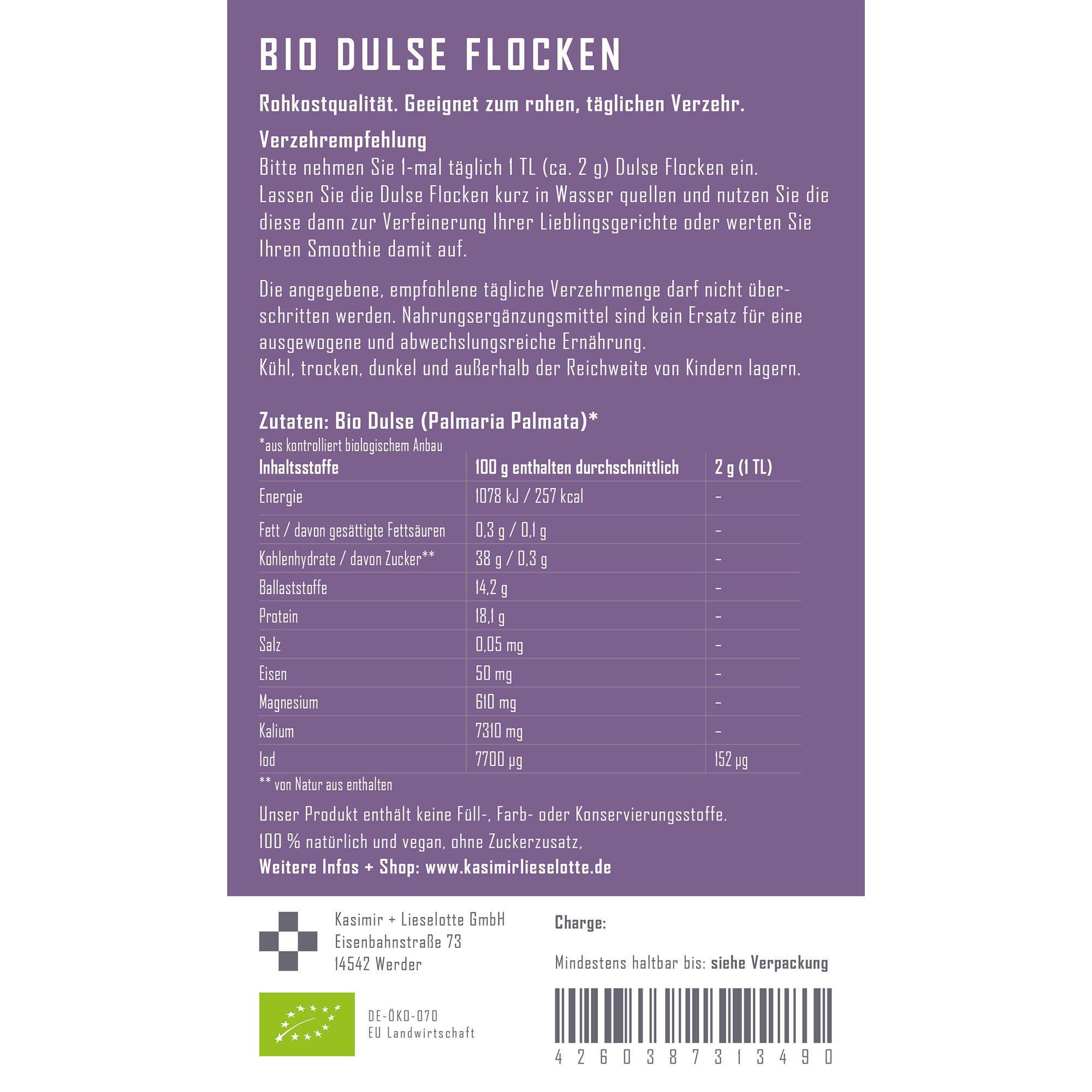 Die Dulse-Alge (Plamaria palmata) ist eine ideale Ergänzung für eine ausgewogene und gesunde Ernährung. Nachdem die Algen in den klaren, kalten Wassern der Bretagne herangewachsen sind, werden sie bei niedrigen Temperaturen schonend getrocknet und zu Bio-Dulse-Flocken geschnitten. Dulse ist auch als Lappentang bekannt und kommt in den Küstengewässern des Pazifiks und des Atlantiks vor. Die geschnittenen Algen stammen aus kontrolliert-biologischem Anbau. 100 % natürlich und vegan, ohne Chemikalien und Zusatzstoffe.