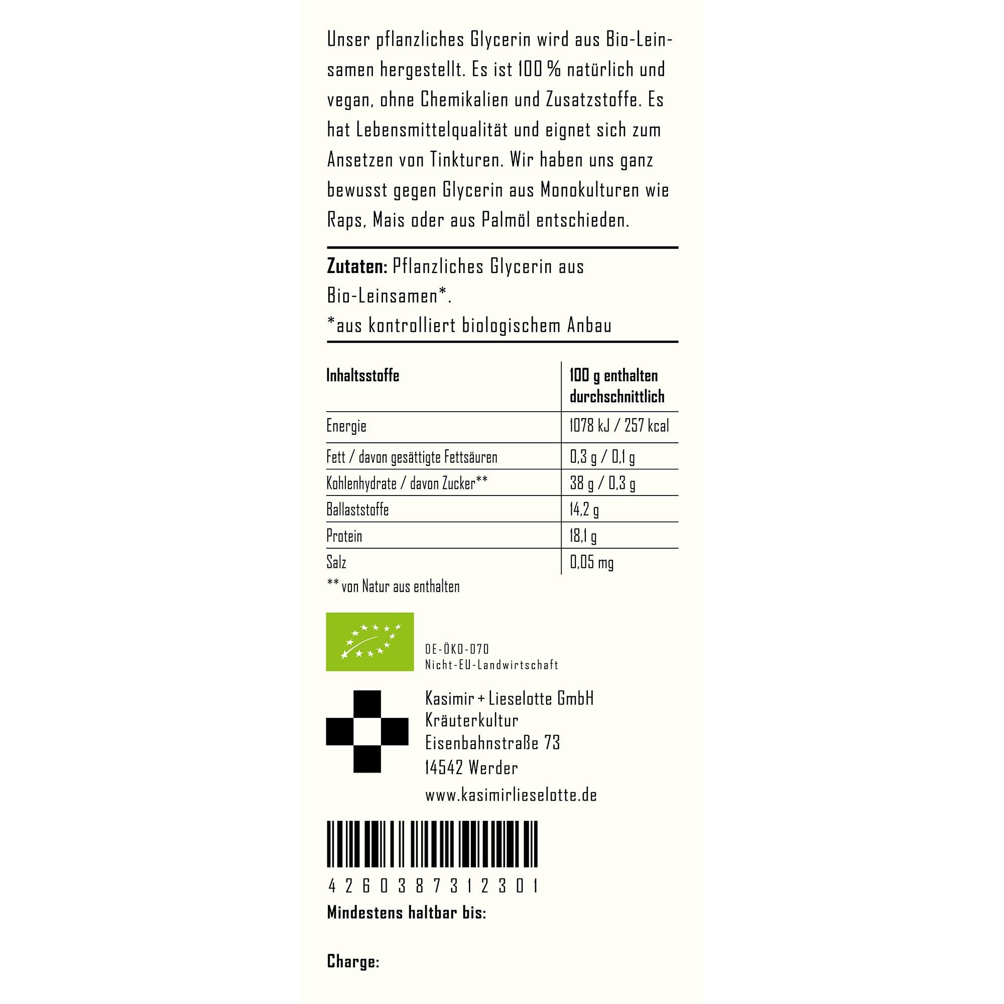 Rein pflanzliches Glycerin aus Bio-Leinsamen*.