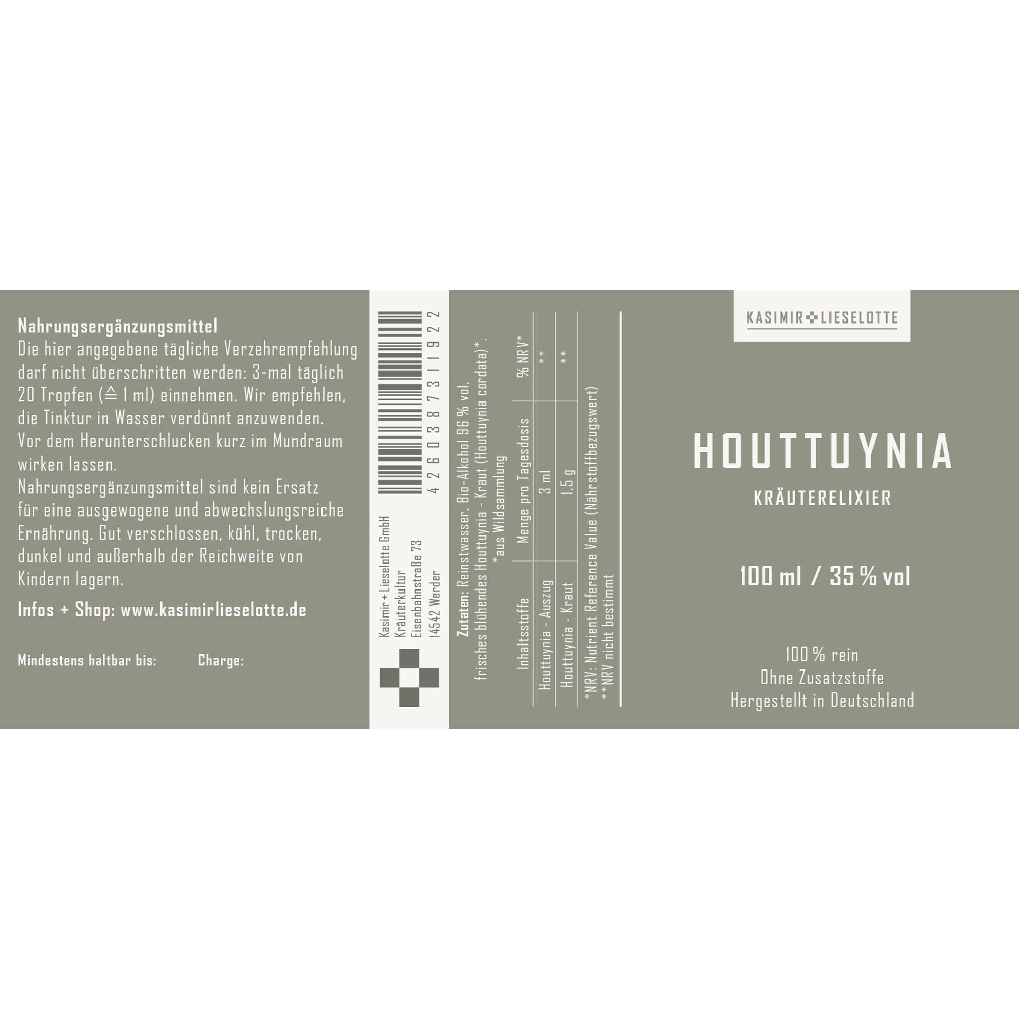 Reinstwasser, Bio-Alkohol (Alk. 96% vol), frisches Houttuynia-Kraut und -Blüten (Houttuynia cordata).