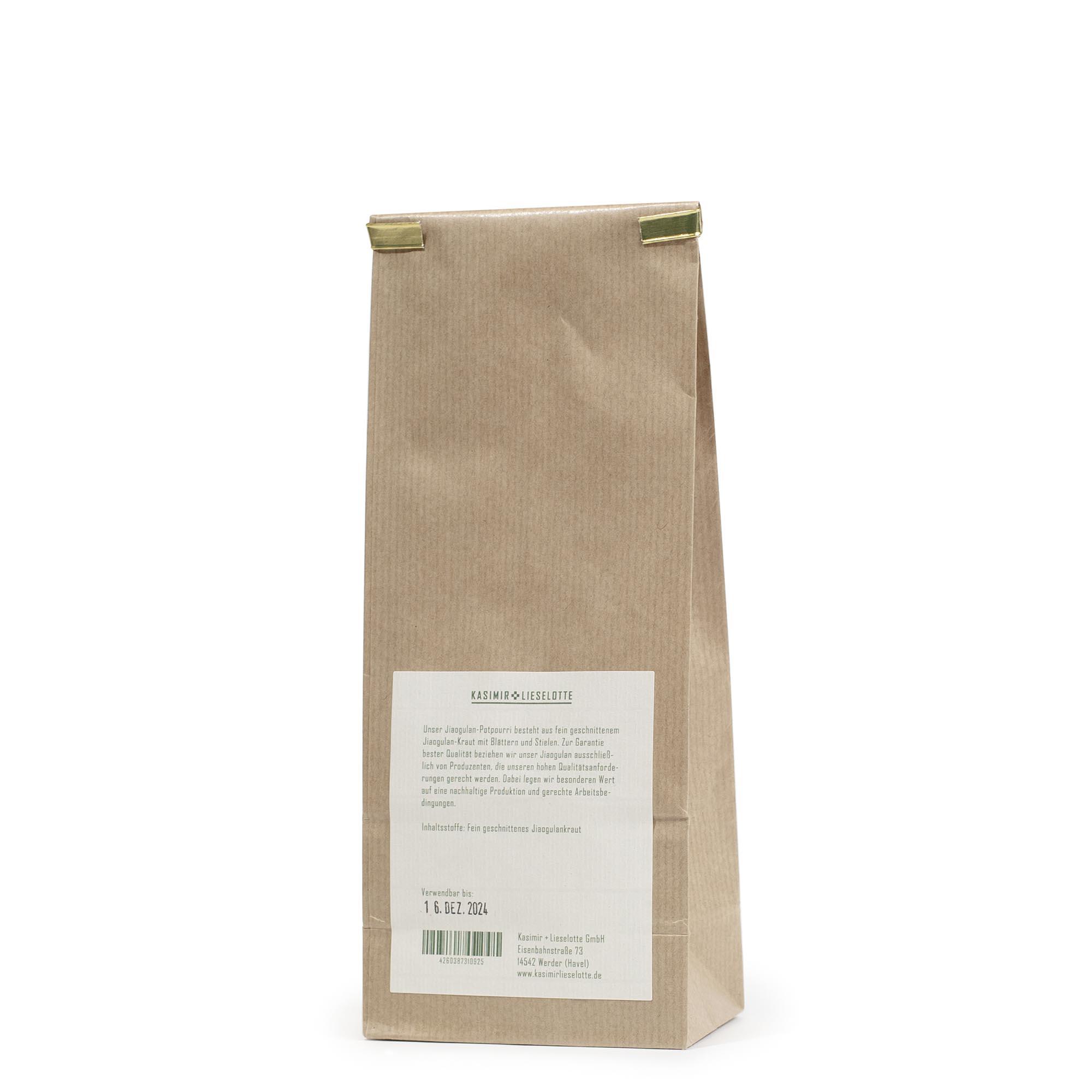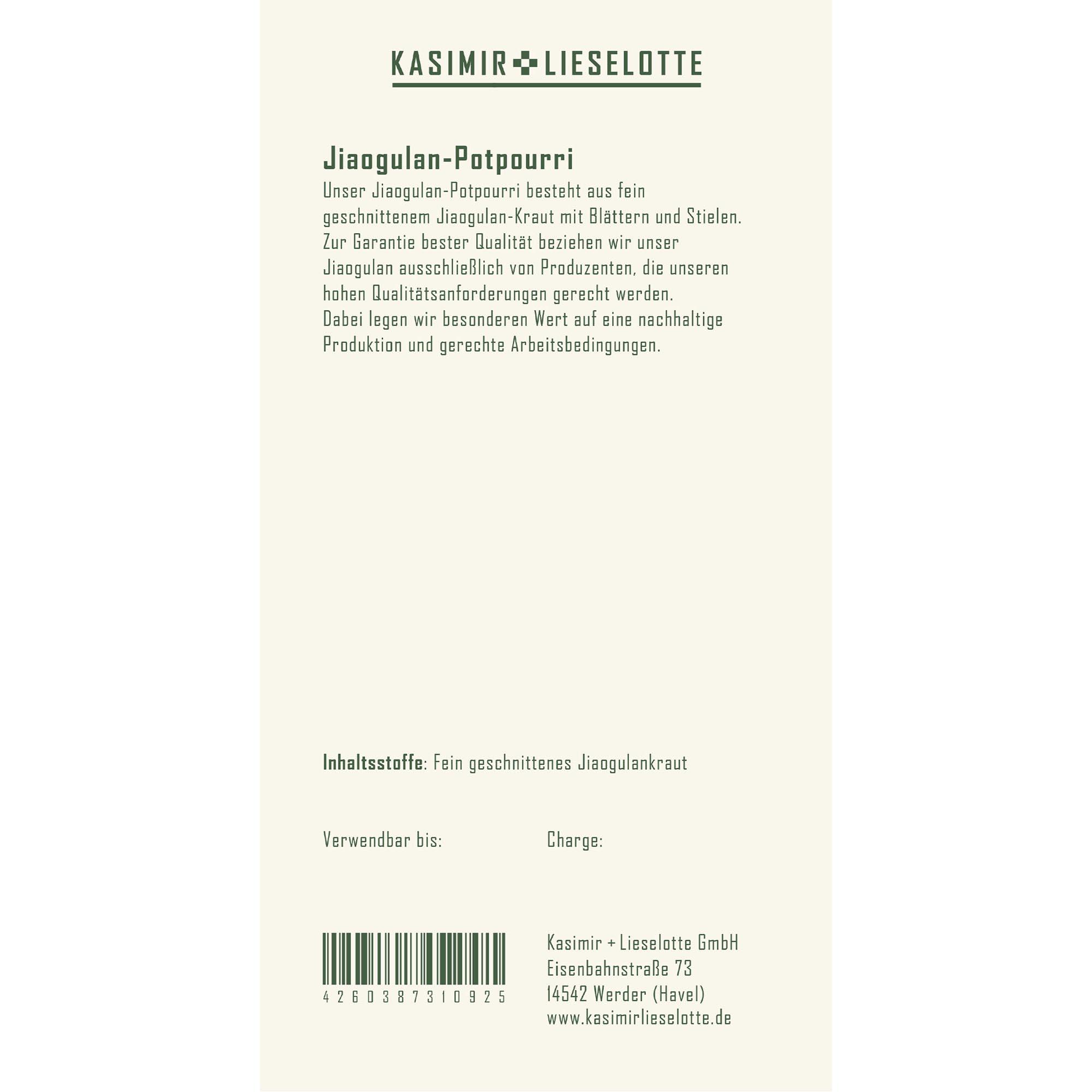 Unser Jiaogulan-Potpourri besteht aus dem schonend getrocknetem Kraut (Blätter und Stiele) der Jiaogulan-Pflanze. Zur Garantie bester Qualität beziehen wir unser Jiaogulan ausschließlich von Produzenten, die unseren hohen Qualitätsanforderungen gerecht werden. Dabei legen wir besonderen Wert auf eine nachhaltige Produktion und gerechte Arbeitsbedingungen.