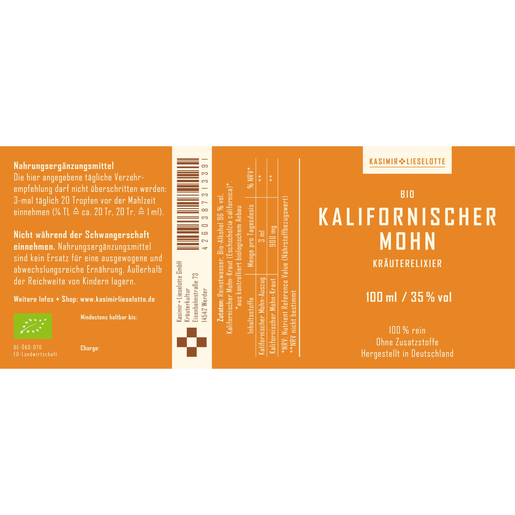 Reinstwasser, Bio-Alkohol (Alk. 96% vol), Bio Kalifornischer-Mohn-Kraut.