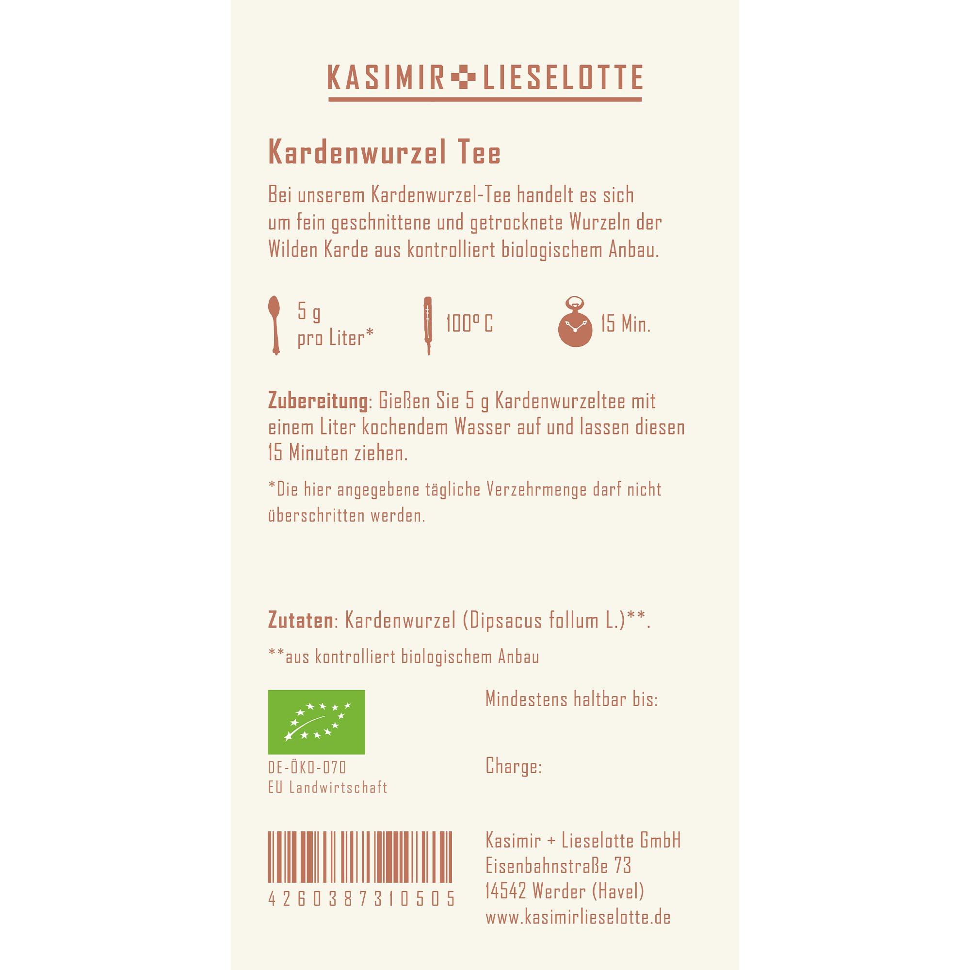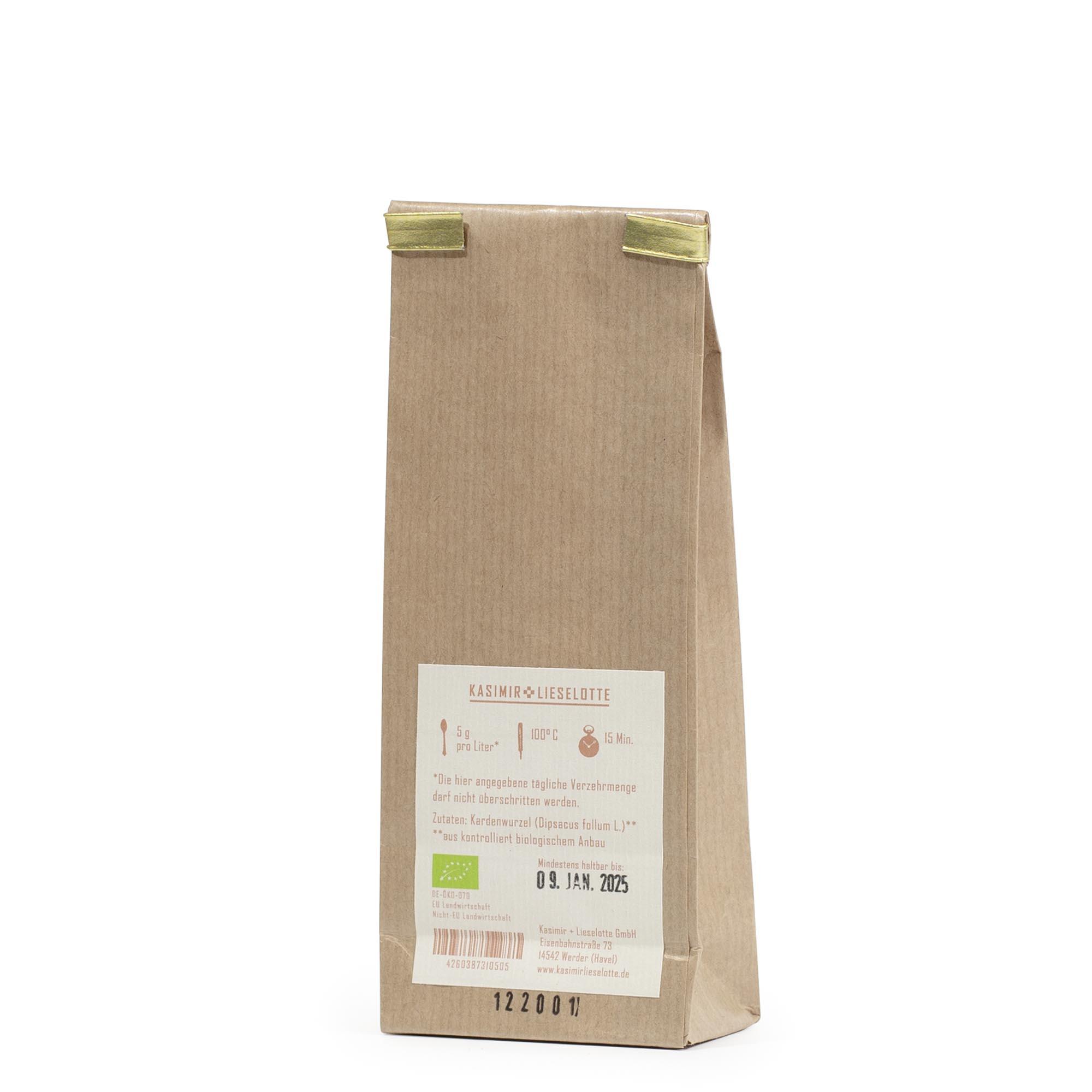 Bei unserem Kardewurzel-Tee handelt es sich um fein geschnittene und getrocknete Wurzeln der Wilden Karde aus kontrolliert biologischem Anbau.