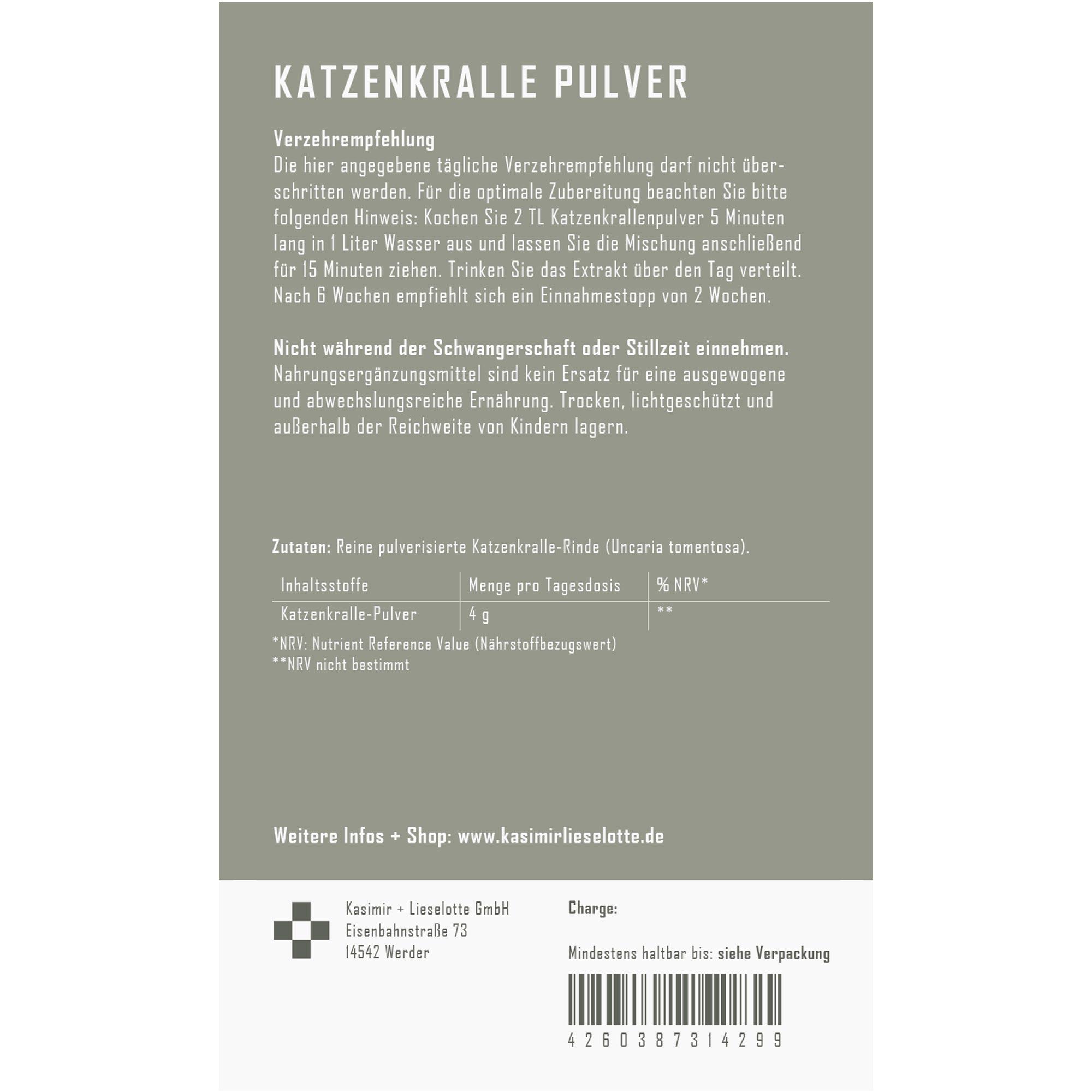 Bei Kinderwunsch, in der Schwangerschaft und Stillzeit sollte auf die Einnahme von Katzenkralle verzichtet werden. Ob und welche Nahrungsergänzungsmittel in dieser Zeit sinnvoll sind, sollte vor der Einnahme grundsätzlich mit dem Arzt oder Heilpraktiker des Vertrauens besprochen werden.