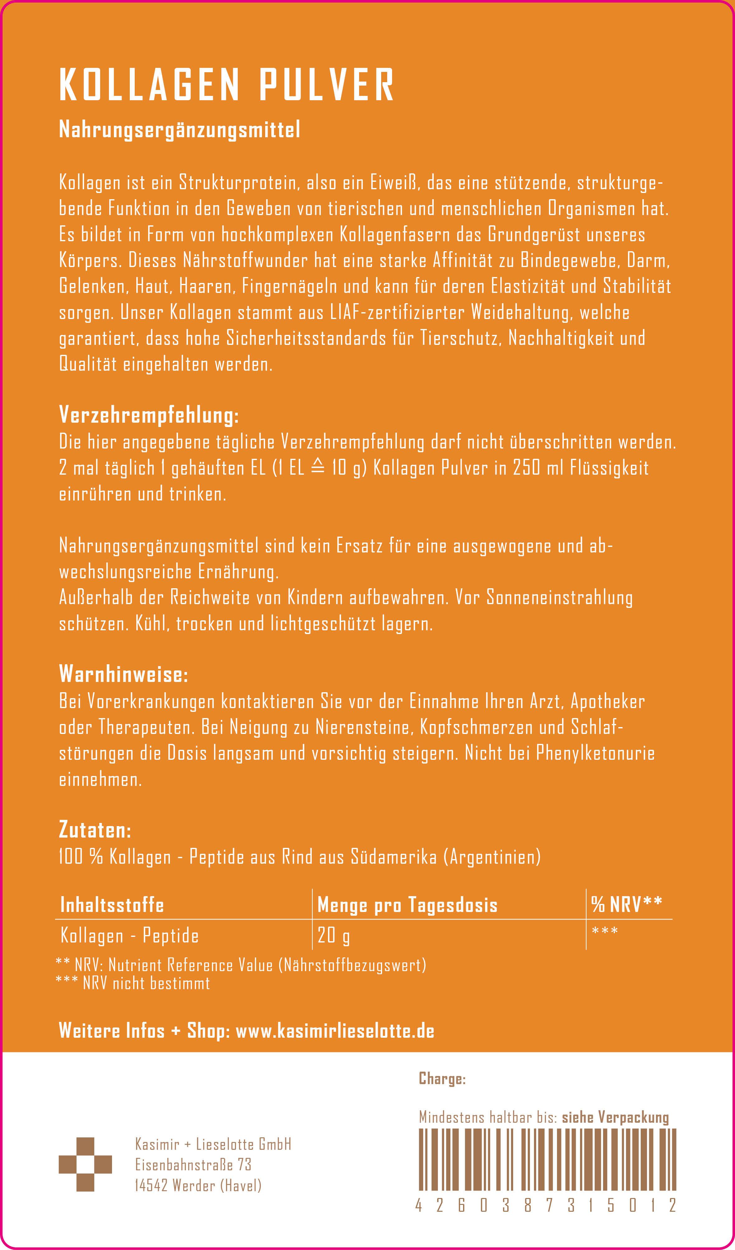 - Zutaten: 100 % hydrolysiertes Kollagen vom Rind (Kollagenhydrolysat)