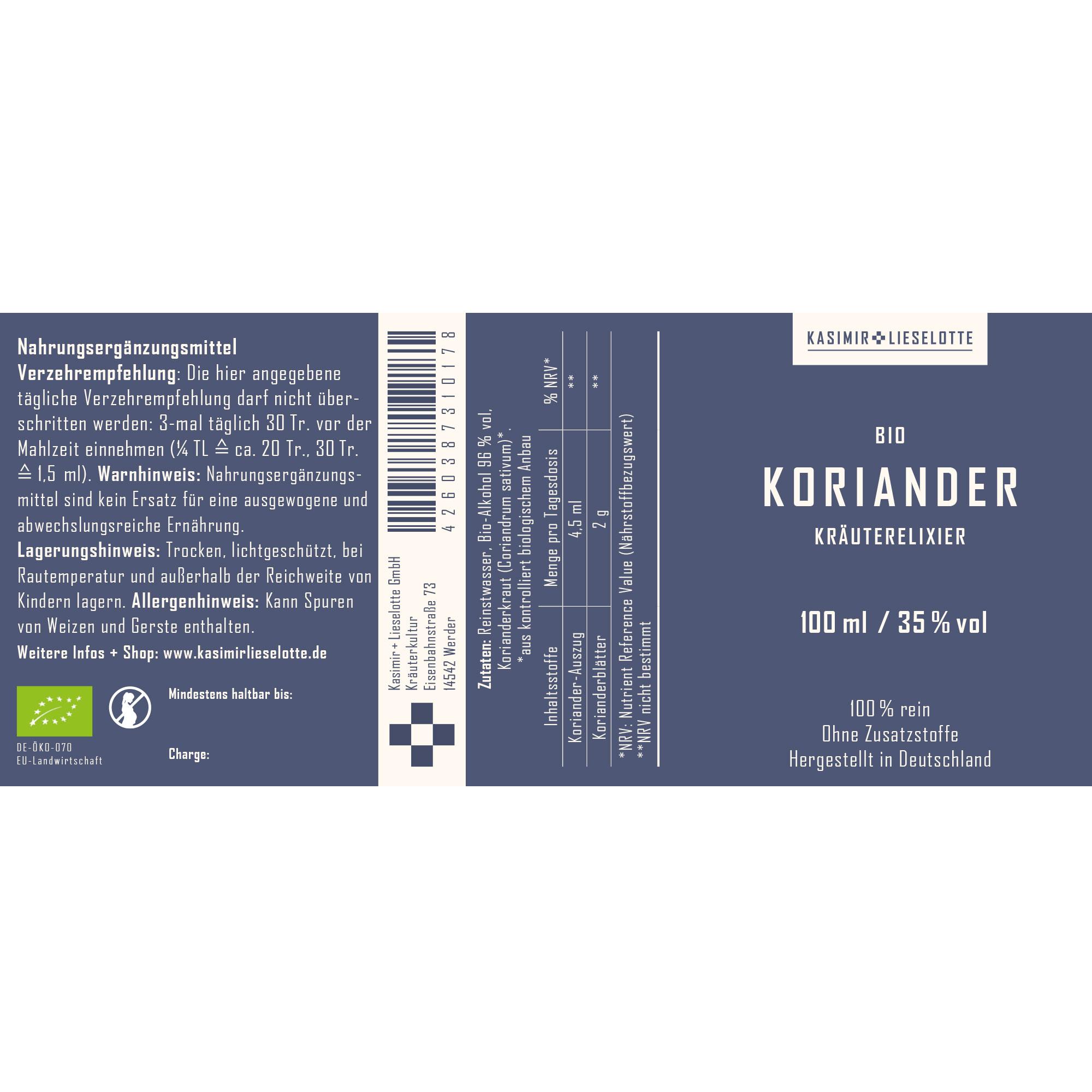Reinstwasser, Bio-Alkohol (Alk. 96% vol), Korianderkraut*.