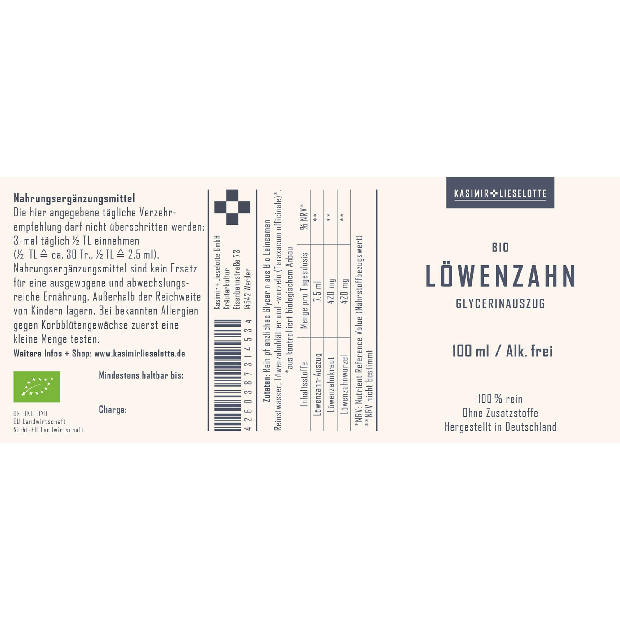 Rein pflanzliches Glycerin aus Bio-Leinsamen, Reinstwasser, Löwenzahn (Taraxacum officinale). Nährwertdeklaration