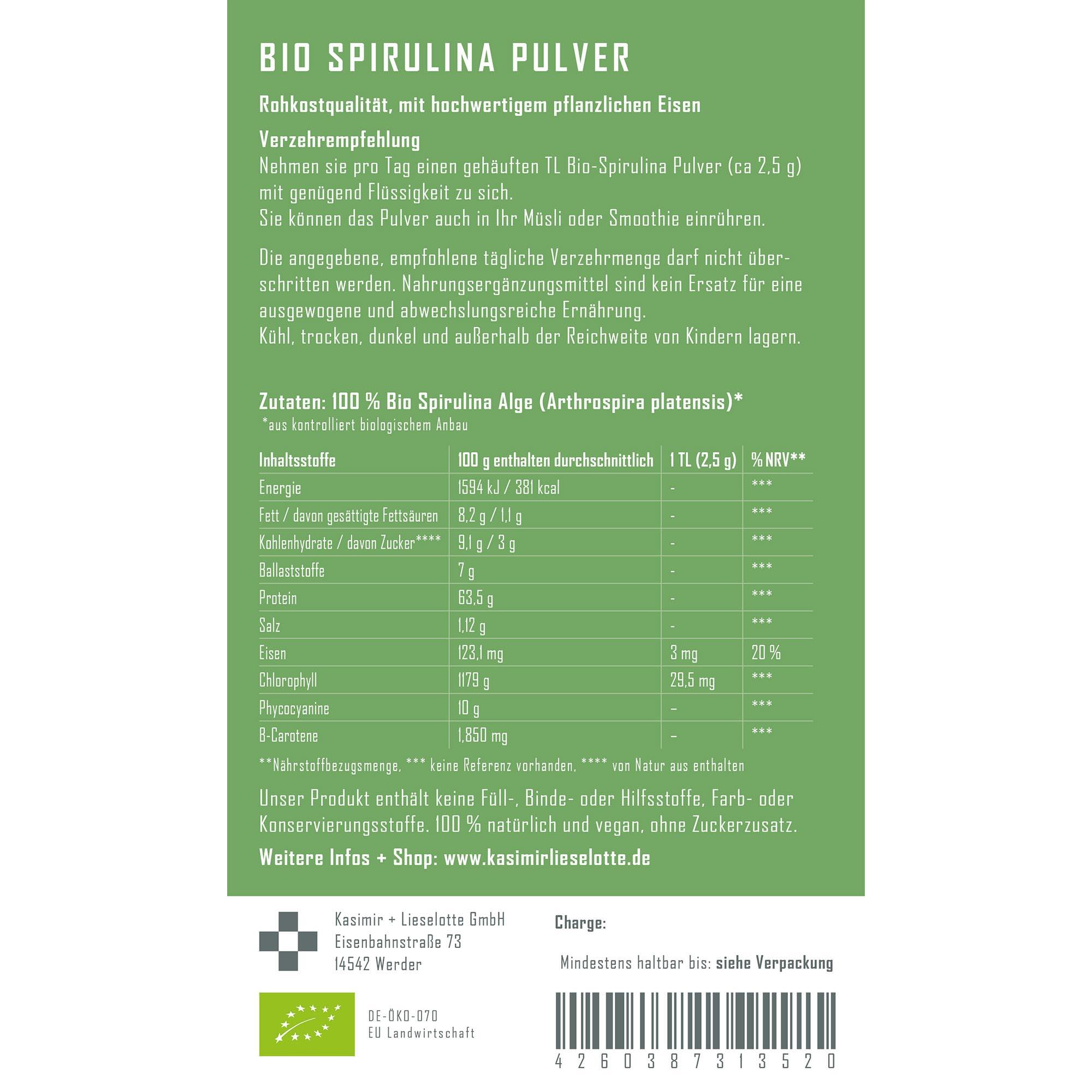 Nehmen sie pro Tag 2,5 g Bio-Spirulina Pulver (= ca. 1 gehäufter TL) mit genügend Flüssigkeit zu sich.