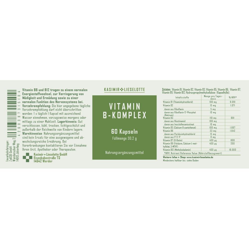 Thiaminhydrochlorid (Vitamin B1), Calcium-D-pantothenat (Vitamin B5), Nicotinamid (Vitamin B3), Pyridoxinhydrochlorid (Vitamin B6), Riboflavin (Vitamin B2), Riboflavin-5'-phosphat-Natrium (aktive Form von Vitamin B2), Inositolhexanicotinat (Flush-freies Niacin), Pyridoxal-5'-phosphat (aktive Form von Vitamin B6), Calcium-L-methylfolat (aktive Form von Folat), D-Biotin (Vitamin B7), Methylcobalamin (aktive Form von Vitamin B12), Überzugsmittel: Hydroxypropylmethylcellulose (Kapselhülle)