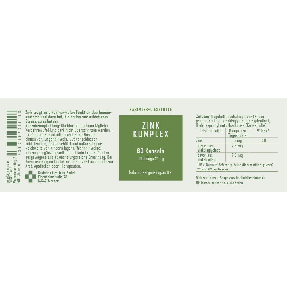 Zink Komplex vereint zwei hochwertige organische Zinkverbindungen – Zinkbisglycinat und Zinkpicolinat – mit natürlichem Hagebuttenschalenpulver. Die Kombination liefert nicht nur gut verfügbares Zink, sondern auch wertvolle sekundäre Pflanzenstoffe aus der Hagebutte. Ideal zur Unterstützung von Haut, Haaren, Nägeln sowie für das Immunsystem und die Zellteilung.