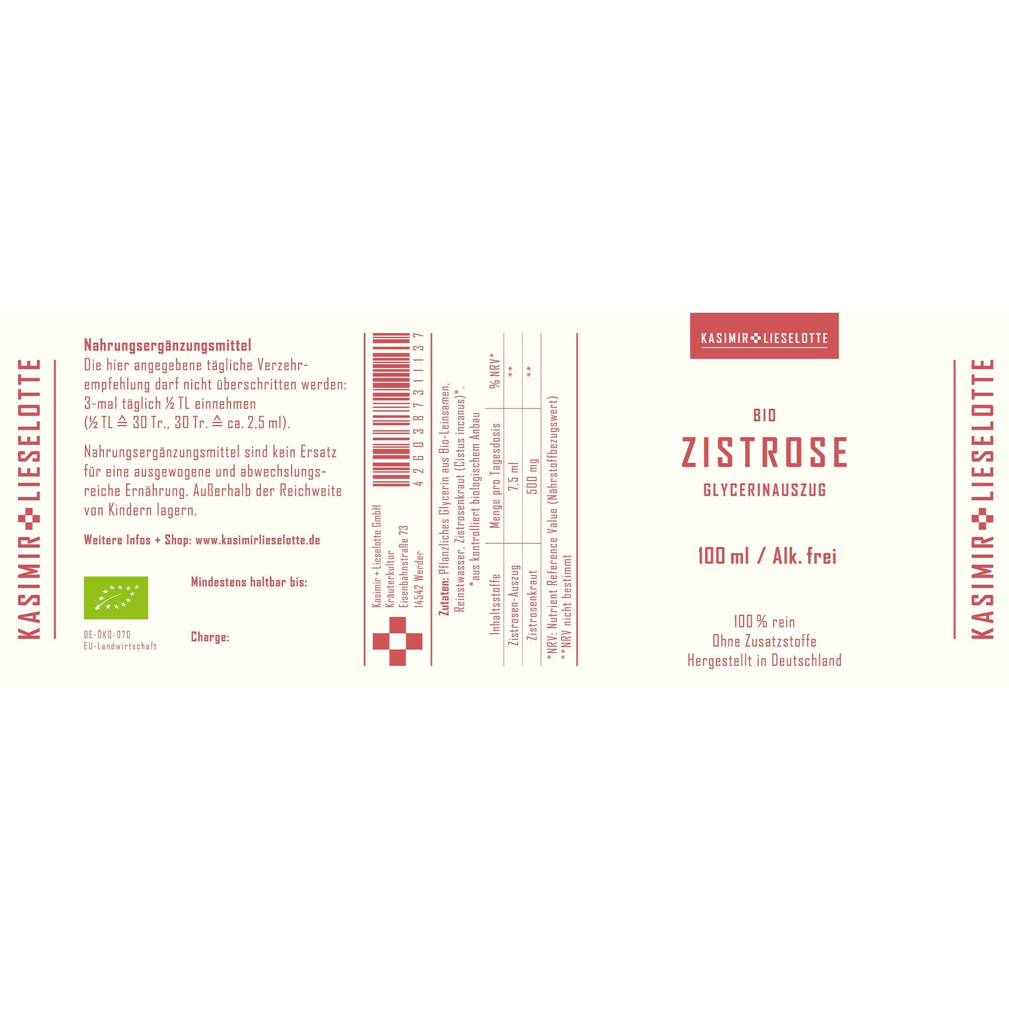 Pflanzliches Glycerin aus Bio-Leinsamen, Reinstwasser, Zistrosenkraut.