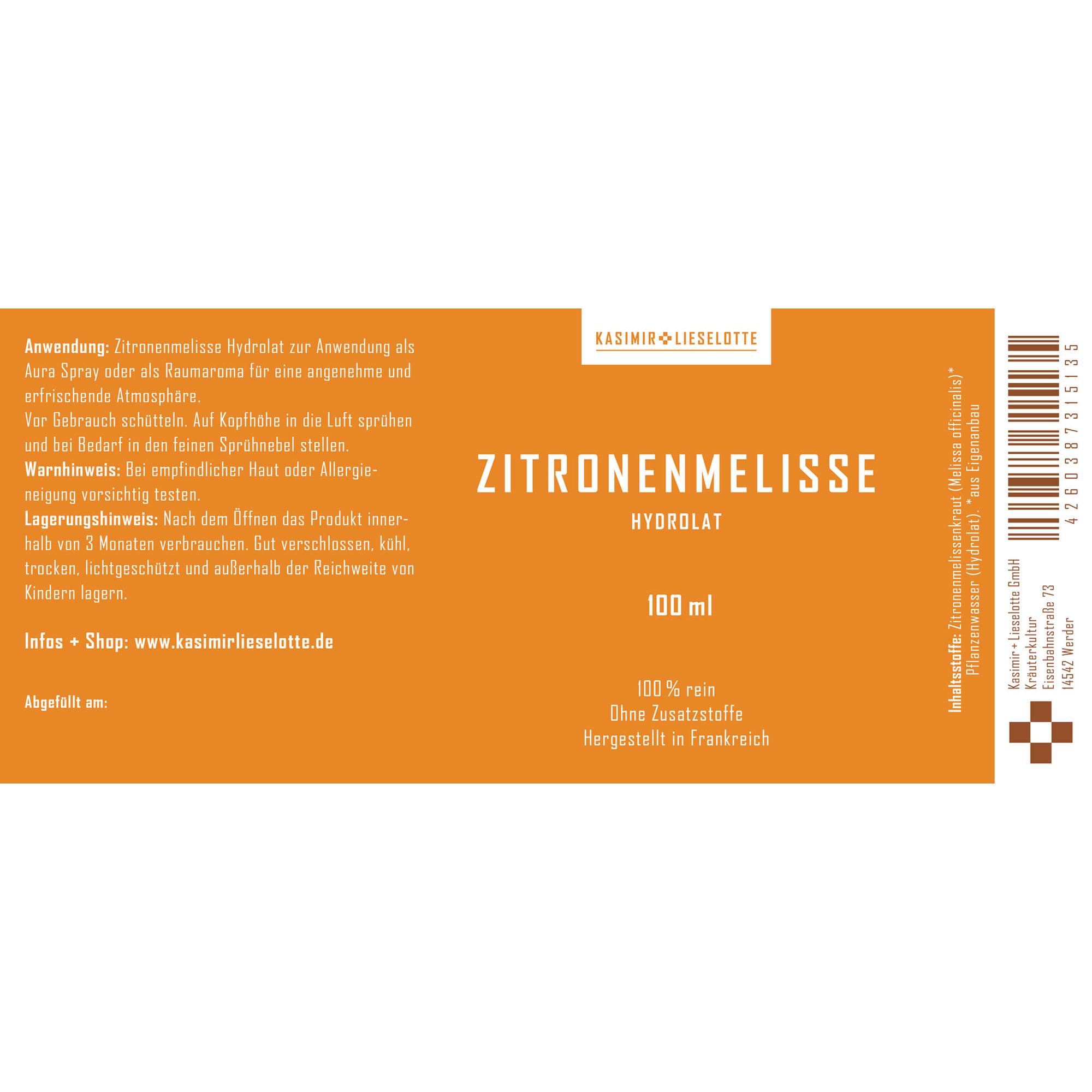 Das Zitronenmelisse Hydrolat von Kasimir und Lieselotte wird aus frischer, sonnenverwöhnter Zitronenmelisse direkt vom eigenen Hof gewonnen. In liebevoller Handarbeit destilliert, enthält es ausschließlich die reinen Wasserdampfdestillate der Zitronenmelisse – ohne Zusätze, Alkohol oder Konservierungsstoffe. Ideal zur Hautpflege, zur Erfrischung im Alltag oder als sanft duftendes Raumspray.