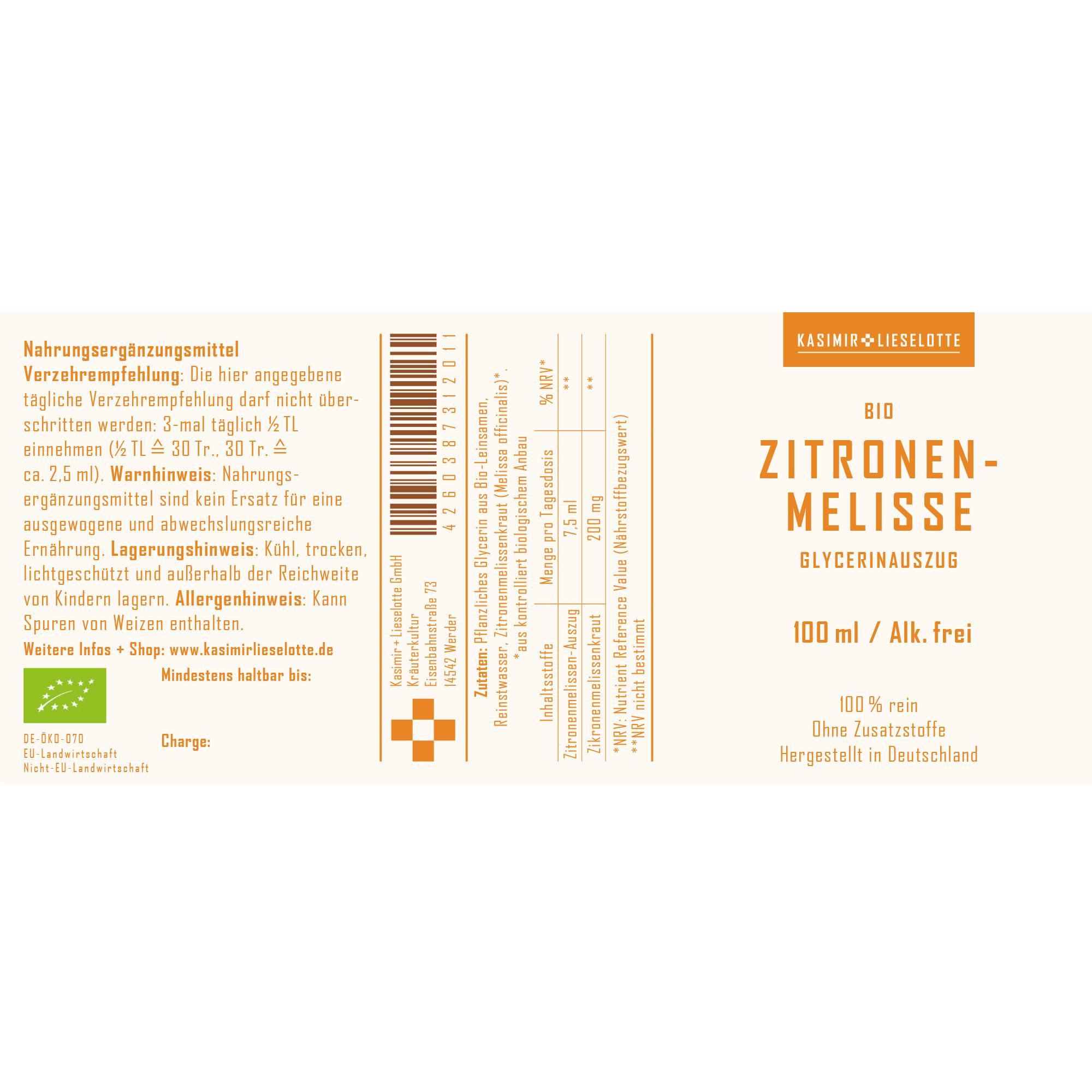 Pflanzliches Glycerin aus Bio-Leinsamen, Reinstwasser, Zitronenmelissenkraut*.